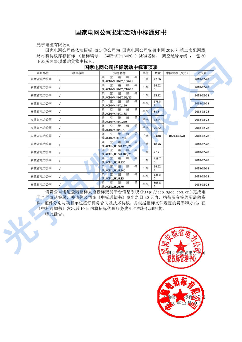 我公司在國家電網(wǎng)公司安徽電網(wǎng)2016年第二批配網(wǎng)線路材料協(xié)議庫存招標(biāo)中,招標(biāo)編號:GWXY-AH-1602C貨物名稱:架空絕緣導(dǎo)線,第三十包。中標(biāo)金額1029萬元。 這次中標(biāo)架空絕緣導(dǎo)線后,我公司完成了在10kv電力電纜、低壓電力電纜、架空絕緣導(dǎo)線各標(biāo)段的中標(biāo)業(yè)績。